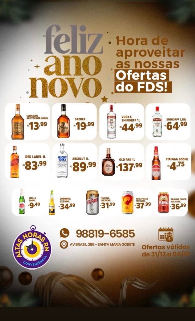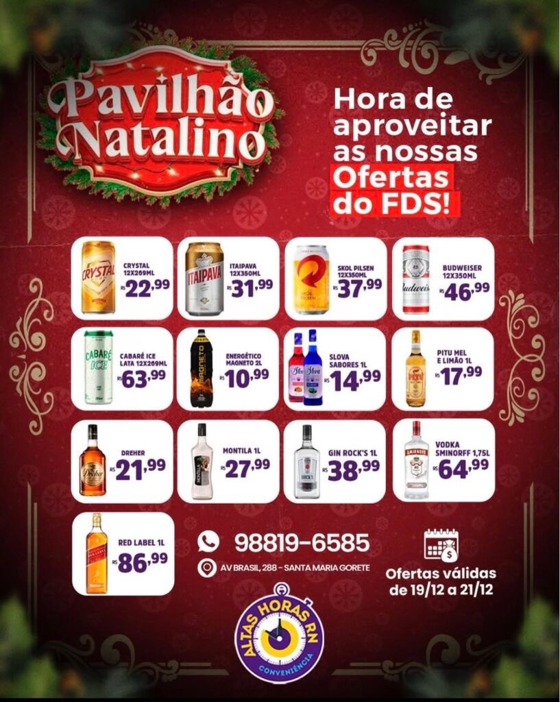 Nesse contexto, a Conveniência Altas Horas divulgou um encarte especial voltado para o período das festividades, reunindo promoções em cervejas, destilados e bebidas mistas. As ofertas contemplam marcas populares e produtos bastante consumidos em eventos de fim de ano, com preços promocionais válidos de 19 a 21 de dezembro.