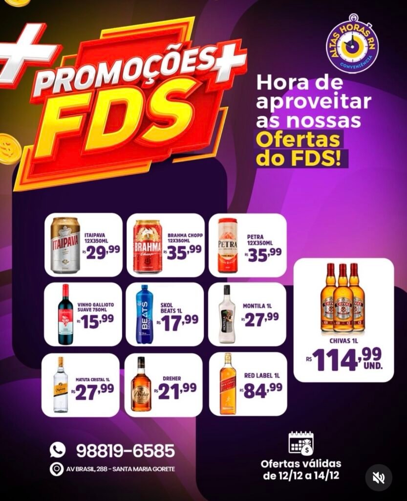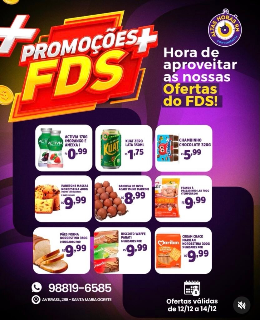A Conveniência Altas Horas funciona na Avenida Brasil, nº 288, bairro Santa Maria Gorete, e disponibiliza contato pelo telefone (88) 98819-6585. Segundo o encarte, as ofertas são válidas por tempo limitado, podendo sofrer alteração conforme a disponibilidade de estoque.